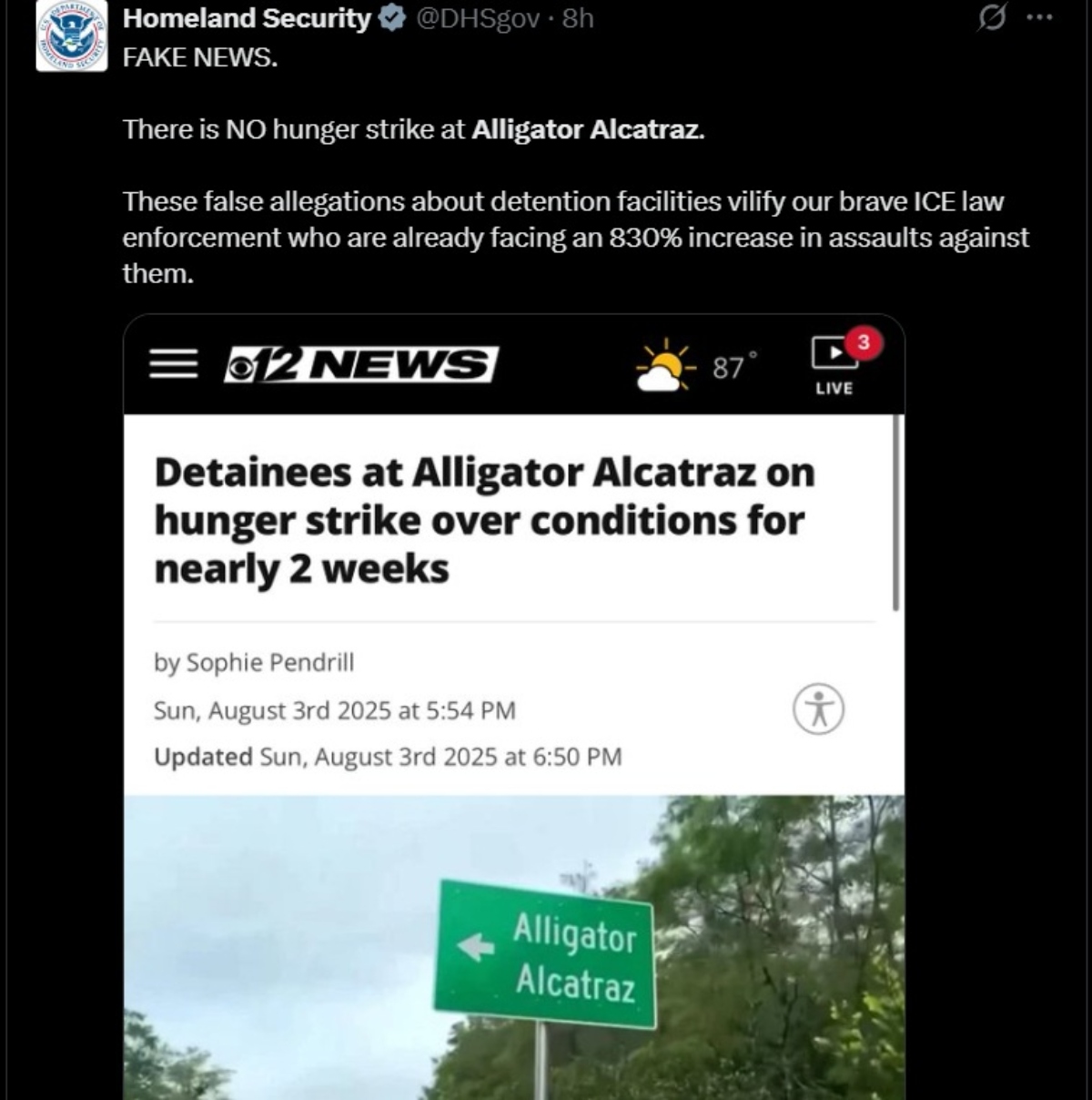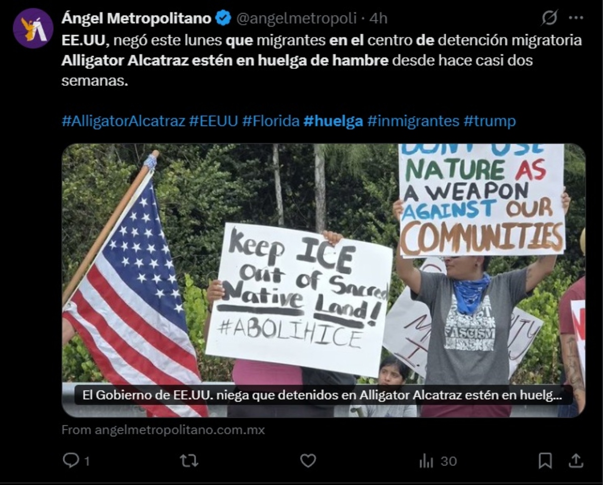 El Departamento de Seguridad Nacional (DHS) publicó en sus redes sociales que las denuncias de una huelga de hambre ininterrumpida por casi dos semanas en Alligator Alcatraz son “noticias falsas”.