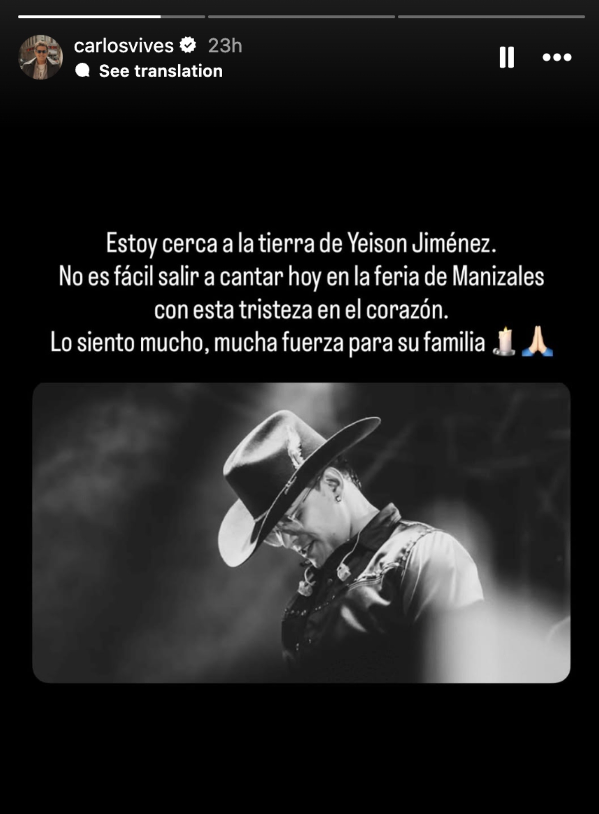 «Estoy cerca a la tierra de Yeison Jiménez. No es fácil salir a cantar hoy en la feria de Manizales con esta tristeza en el corazón. Lo siento mucho, mucha fuerza para su familia», escribió en su cuenta de X Carlos Vives, junto con una foto del artista fallecido, antes de dar un concierto en esa ciudad, capital del departamento de Caldas.