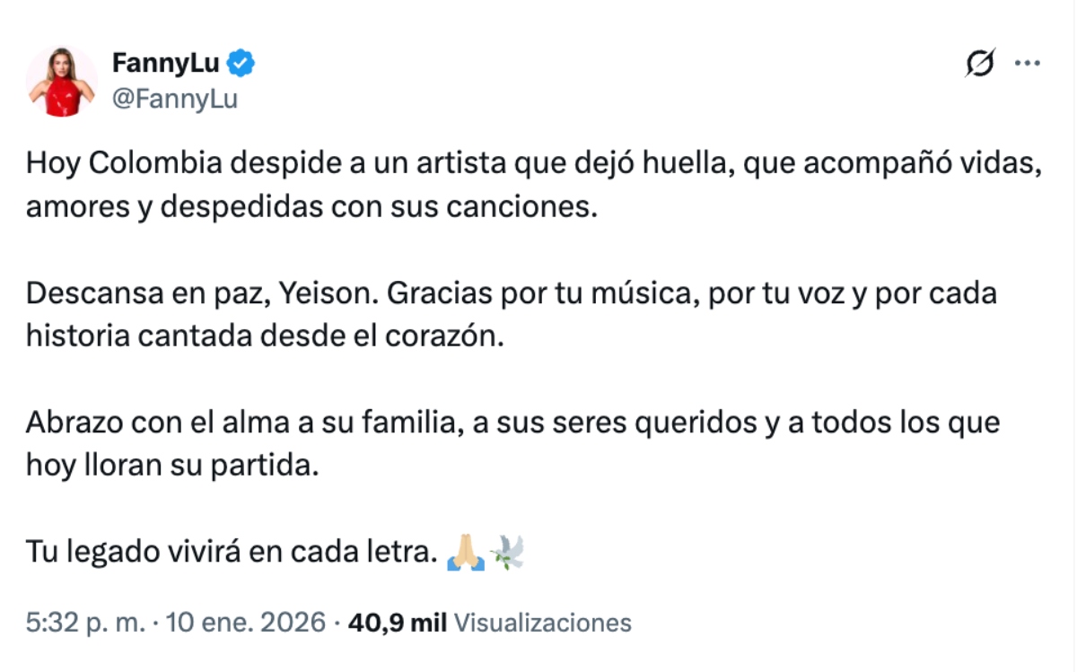 «Hoy Colombia despide a un artista que dejó huella, que acompañó vidas, amores y despedidas con sus canciones. Descansa en paz, Yeison. Gracias por tu música, por tu voz y por cada historia cantada desde el corazón (…) Tu legado vivirá en cada letra», escribió también en X la cantante Fanny Lu.