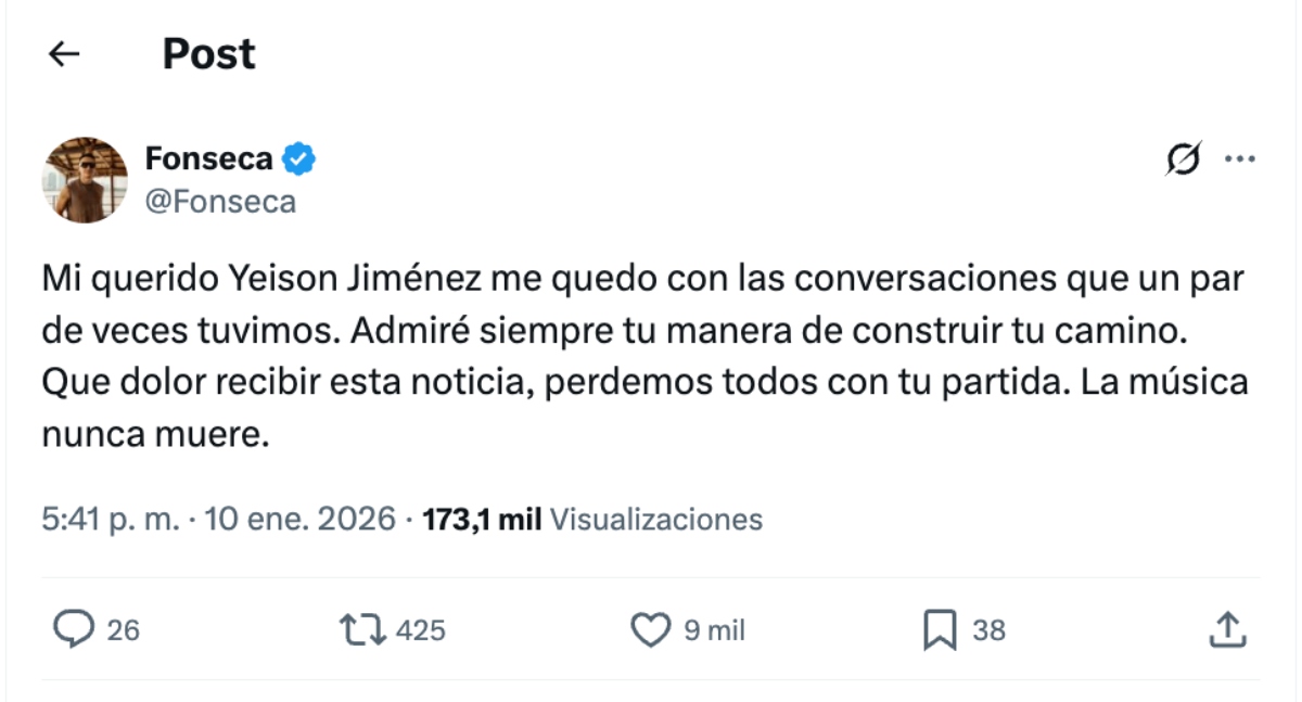 «Mi querido Yeison Jiménez me quedo con las conversaciones que un par de veces tuvimos. Admiré siempre tu manera de construir tu camino. Que dolor recibir esta noticia, perdemos todos con tu partida. La música nunca muere», escribió por su parte Fonseca.