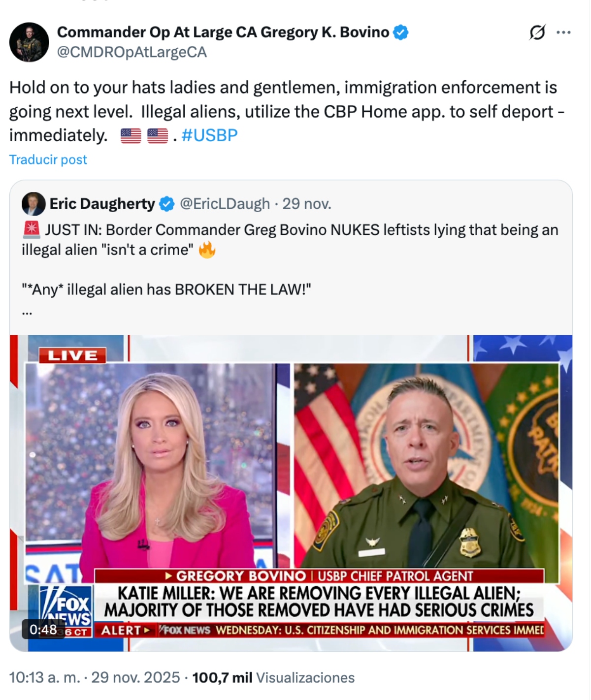 In a message on his X account, Bovino warned that migrants should be on the lookout for tightening operations, but did not specify where he was headed.