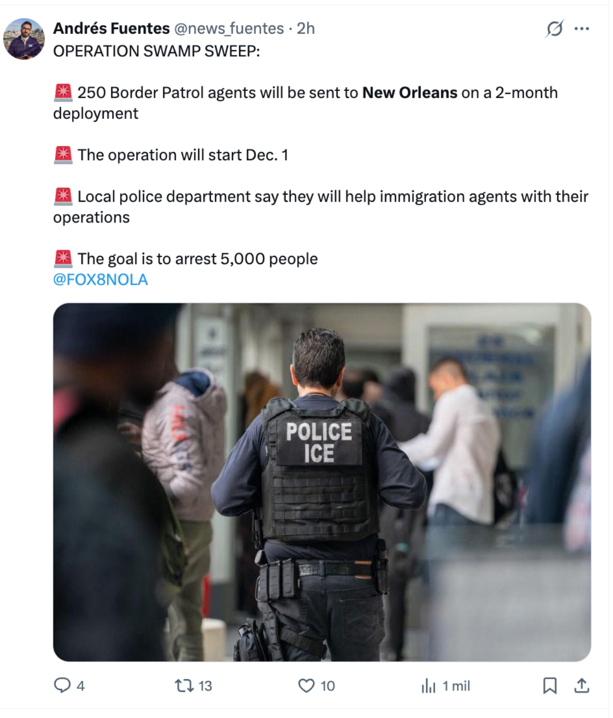 According to these documents, the deployment would formally begin on December 1, 2025, although the first agents will arrive in New Orleans days before Thanksgiving to prepare vehicles, tactical equipment and command centers.