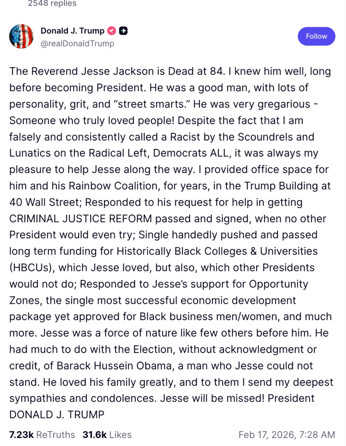 “The Rev. Jesse Jackson has died at 84. I knew him well, long before he was president. He was a good man, with a lot of personality, courage and ‘street smarts.’ He was very personable, someone who really loved people,” he wrote on his network Truth Social.