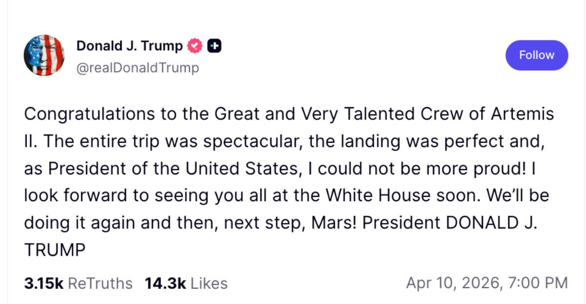 Trump congratulates Artemis II