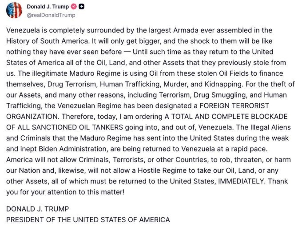 U.S. President Donald Trump ordered on Tuesday “the total and complete blockade of all sanctioned oil tankers entering and leaving Venezuela”, in a further step in Washington’s escalation of pressure on the government of Venezuelan President Nicolas Maduro.