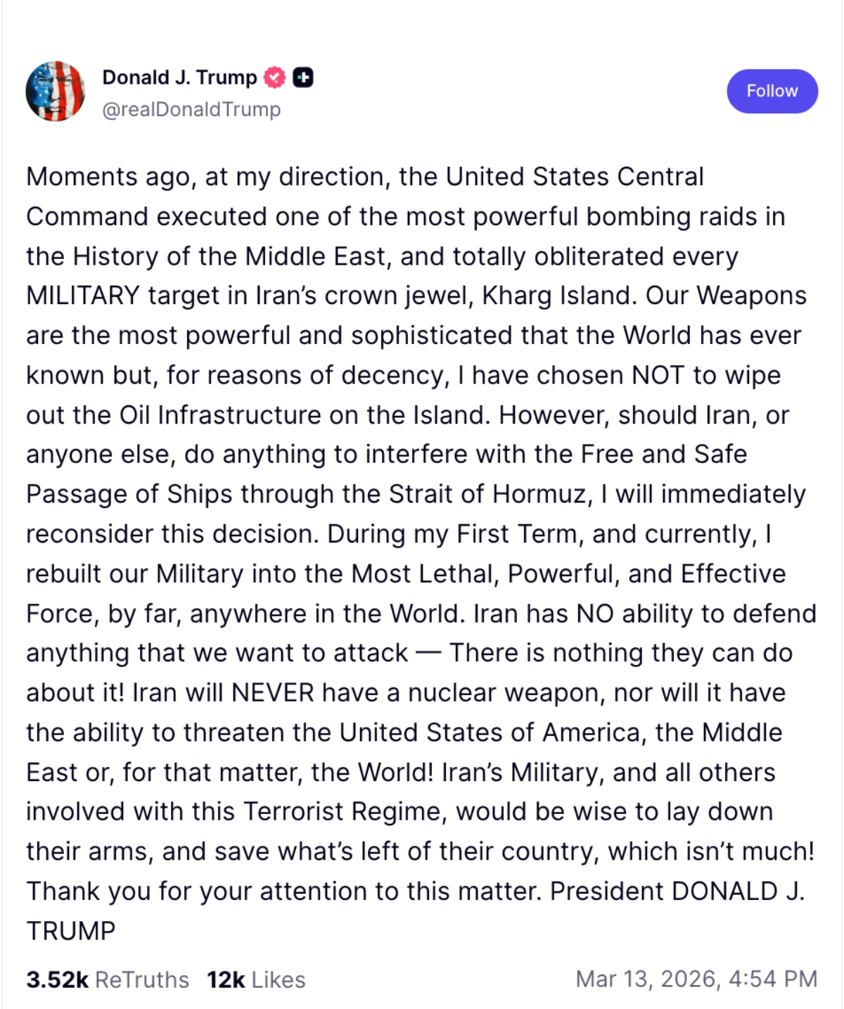 “Moments ago, at my direction, the United States Central Command executed one of the most powerful bombing raids in the History of the Middle East, and totally obliterated every MILITARY target in Iran’s crown jewel, Kharg Island…. Iran has NO ability to defend anything that we… pic.twitter.com/2iEzCOyA3P