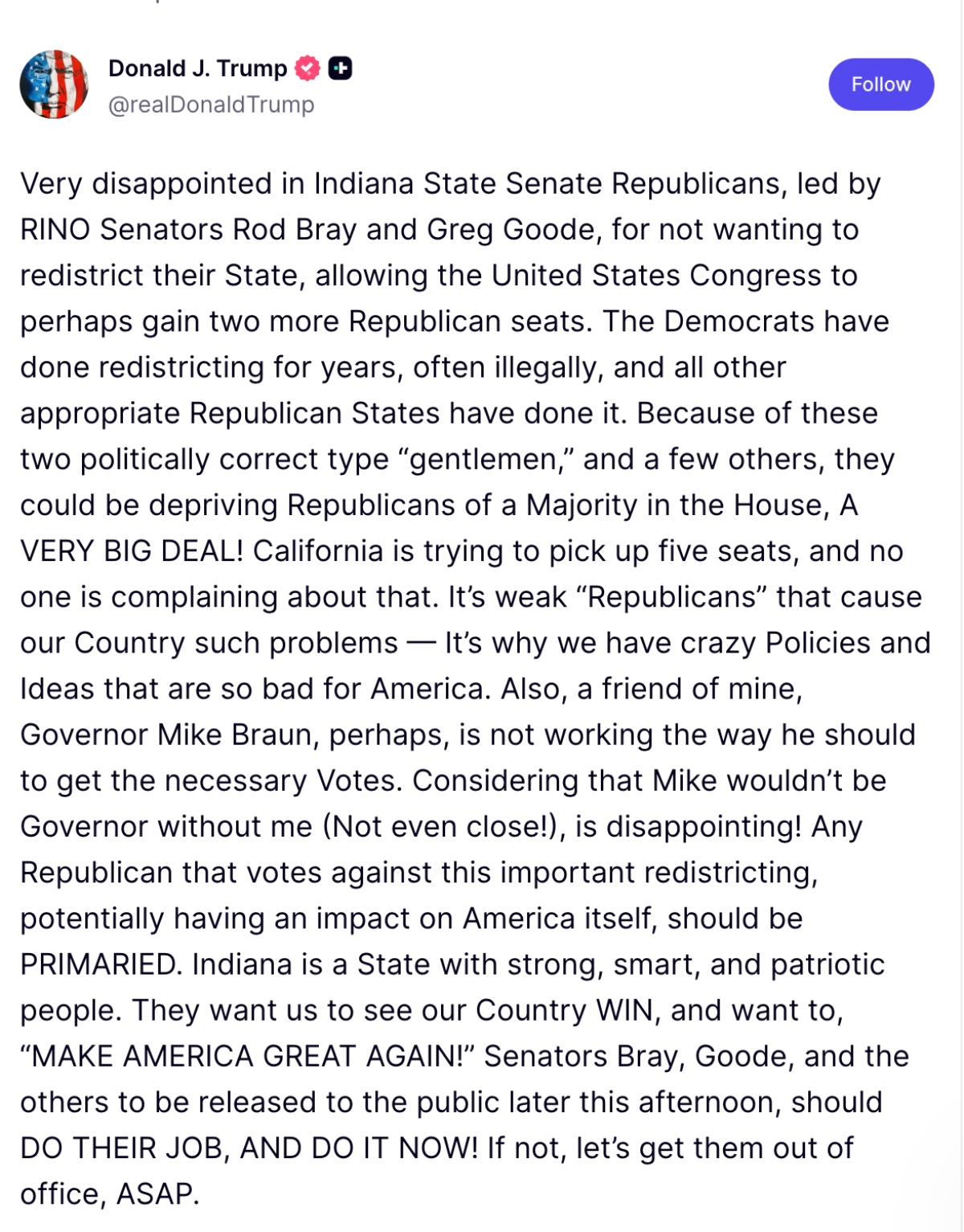 Trump said in a Truth Social network post that he is “very disappointed” that Indiana Senate President Rodric Bray, R-Republican, announced Friday that the state chamber will not hold a special session in December to address redistricting called for by the White House.