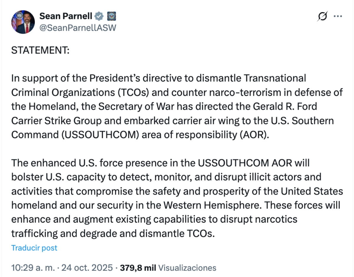 The U.S. Department of Defense announced Friday the deployment of the aircraft carrier USS Gerald R. Ford, the largest and most advanced of the U.S. fleet, to the Caribbean Sea.
