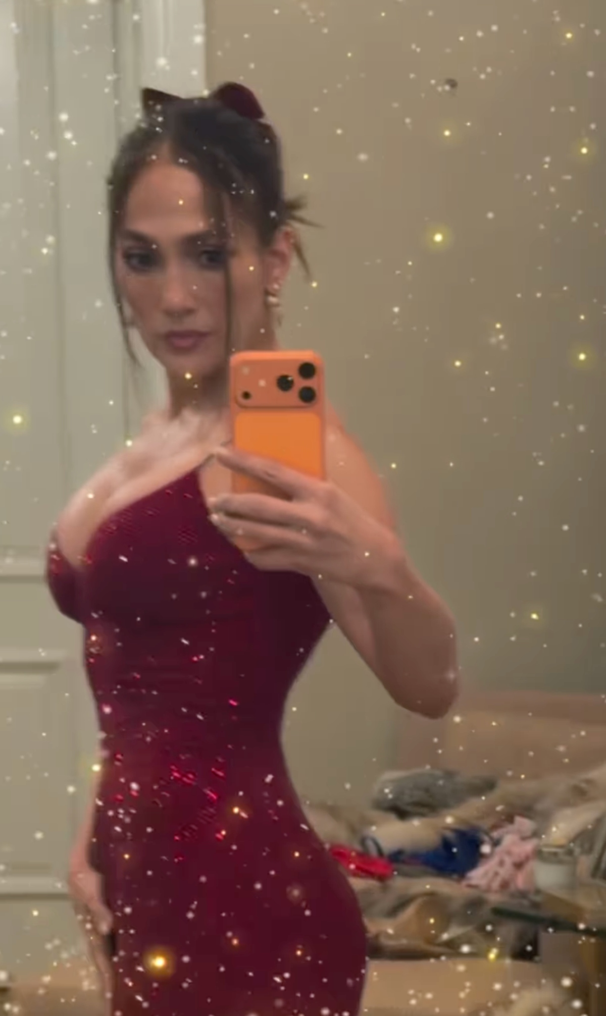 Jennifer Lopez también compartió su atuendo para la cena, un vestido rojo ceñido con detalles brillantes, con el que brindó frente a la cámara y sonrió con naturalidad.