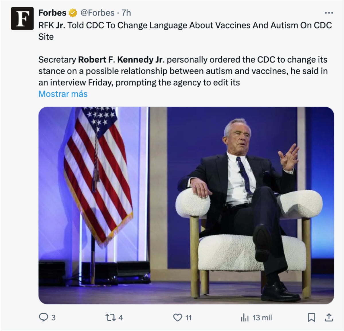 El secretario de Salud de EE.UU., Robert F. Kennedy Jr., anunció este viernes que había instruido a los Centros para el Control y la Prevención de Enfermedades (CDC) a modificar su página web para vincular la vacunación con los casos de autismo, alineándose con su ideología antivacunas de largo recorrido.