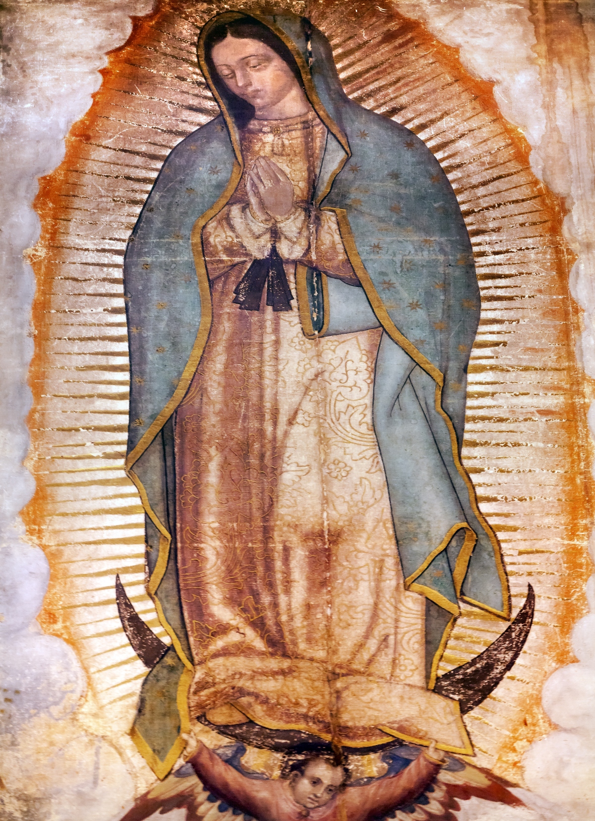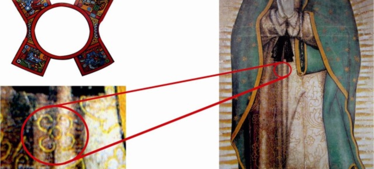 Justo sobre el vientre de la Virgen de Guadalupe aparece un símbolo conocido como Nahui Ollin, una flor de cuatro pétalos que representaba, para los pueblos originarios del centro de México, el centro del universo, la vida y lo divino.