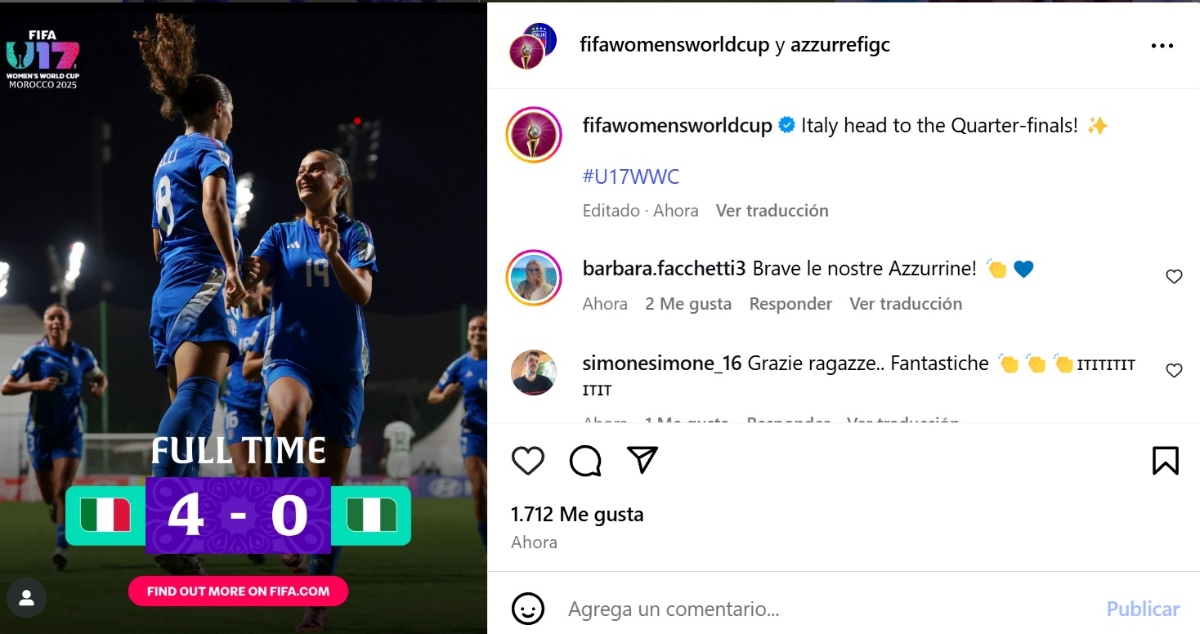 En uno de los últimos encuentros del día de este Mundial Femenino Sub-17, Italia superó sin apuros a Nigeria por 4-0.