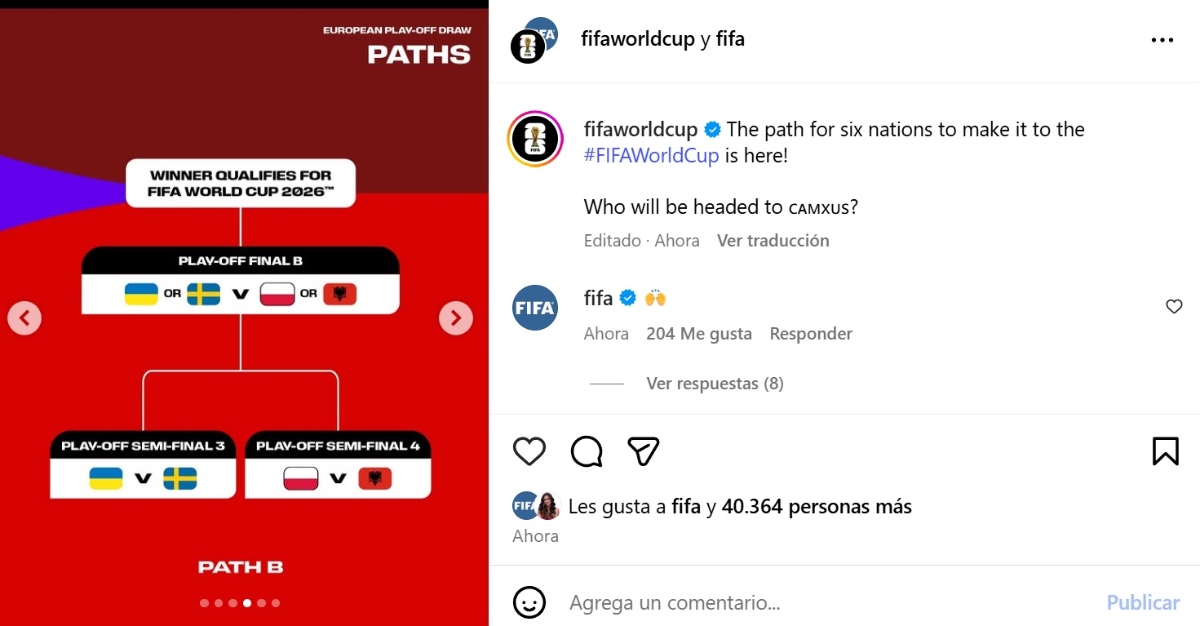 El sorteo celebrado este jueves en la sede de la FIFA en Zúrich (Suiza) fijó también las otras eliminatorias de los diez restantes equipos europeos: Ucrania-Suecia, Eslovaquia-Kosovo, República Checa-Irlanda, Dinamarca-Macedonia del Norte y Gales-Bosnia.