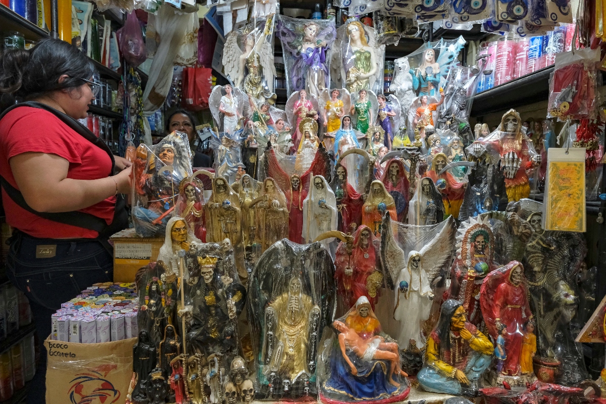 Elizabeth, una de sus fieles, recorre el Mercado de Sonora para cumplir la promesa de comprarles a sus cuatro figuras de la Santa Muerte unos vestidos antes de que termine el año.