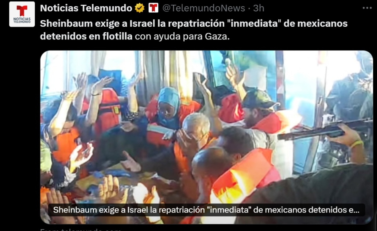 La reacción de Sheinbaum ocurre luego de que el miércoles el gobierno israelí interceptó a la flotilla que zarpó desde Barcelona el pasado 2 de septiembre para llevar ayuda humanitaria a Gaza.