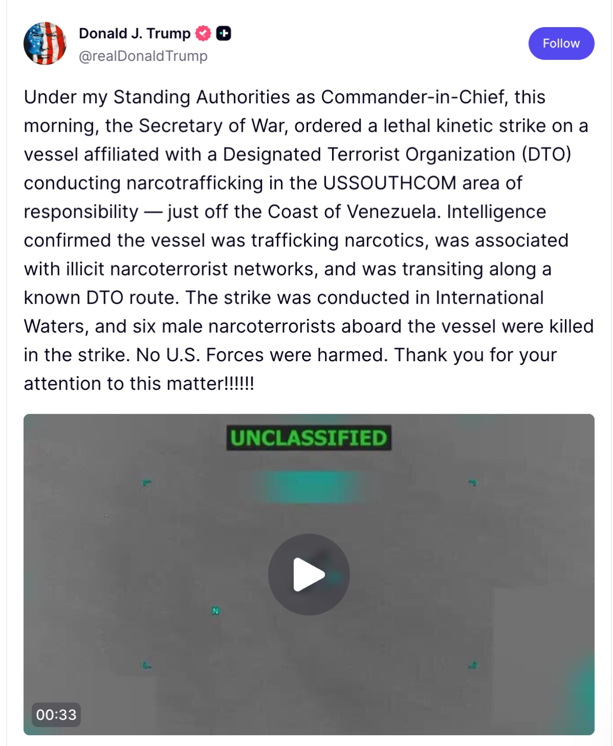 “Esta mañana, el Secretario de Guerra ordenó un ataque cinético letal contra un barco afiliado a una Organización Terrorista Designada (OTD) que realiza narcotráfico en el área de responsabilidad del Comando Sur de los Estados Unidos frente a la costa de Venezuela”, escribió en su red Truth Social.