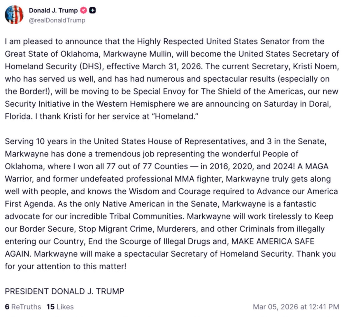 Mullin, el sustituto de Noem, es un empresario de sangre cherokee que en 2023 logró un asiento como senador por Oklahoma.