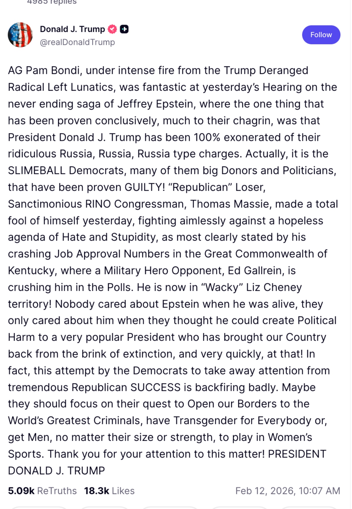 «La Fiscal General Pam Bondi, bajo intensa presión de los lunáticos radicales de izquierda que sufren delirio contra Trump, estuvo fantástica en la audiencia de ayer sobre la interminable saga de Jeffrey Epstein», escribió Trump en su red Truth Social, un día después de la sesión de Bondi ante el Comité Judicial de la Cámara de Representantes.