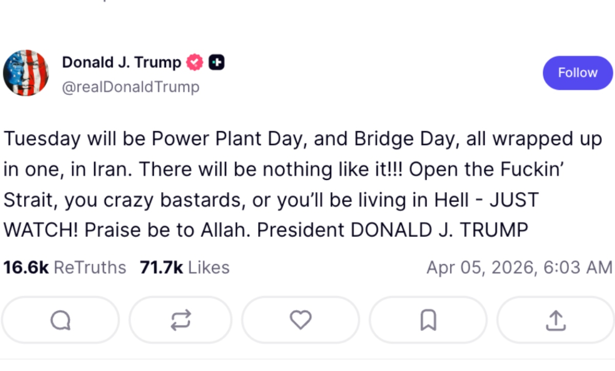 «Abran el p* estrecho, malditos locos, o van a vivir en el infierno. ¡YA LO VERÁN!»**, escribió Trump en Truth Social. Y es que el presidente no anda con juegos; asegura que si no hay un trato para el martes a las 8:00 PM (hora de Washington), mandará a «volar todo por los aires», atacando puentes y plantas de luz en Irán.