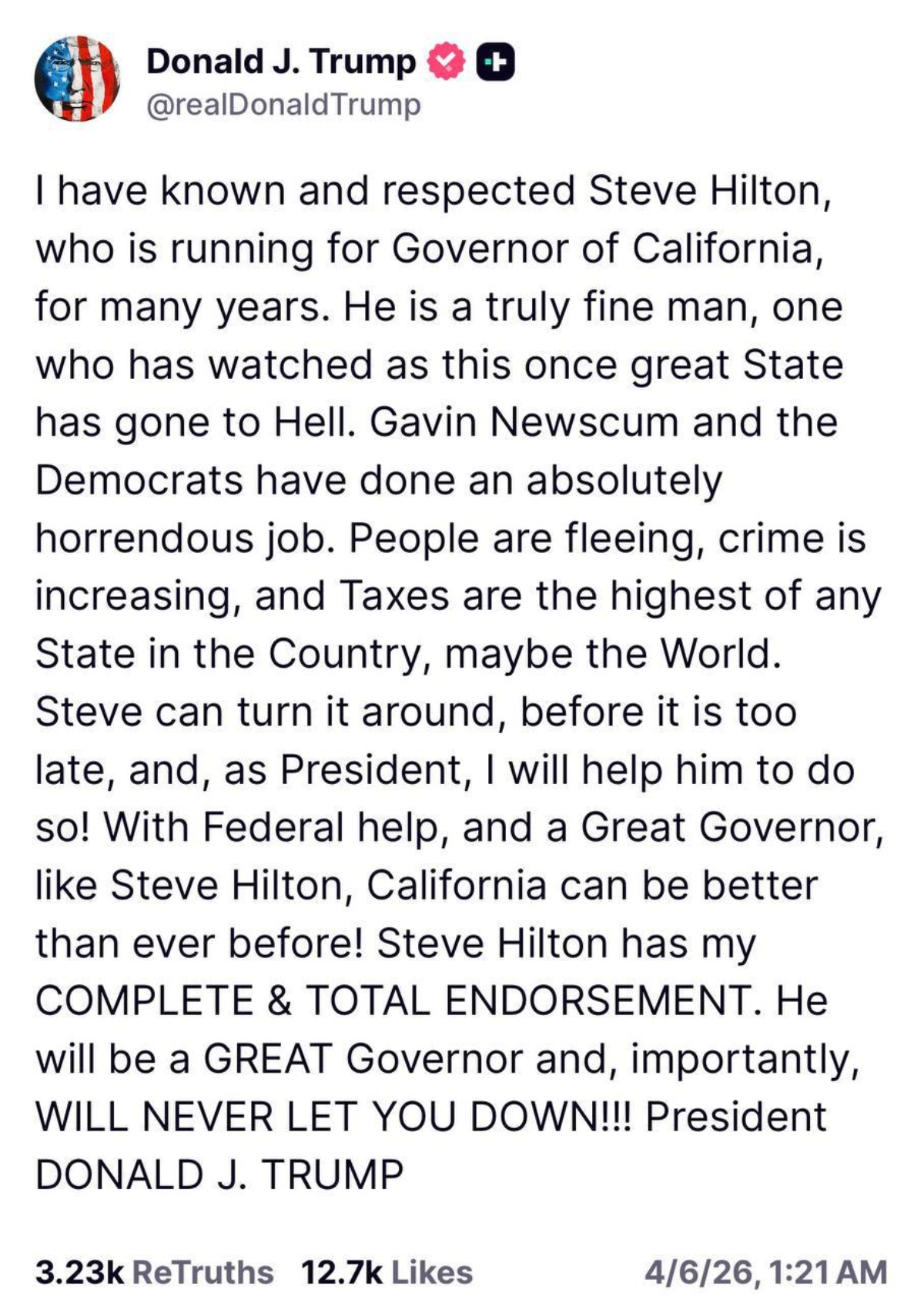 ¿Quién dijo que los republicanos no tenían oportunidad en la tierra de Gavin Newsom? El tablero político de California acaba de saltar por los aires después de que el presidente Donald Trump utilizara su red Truth Social para darle su respaldo oficial a Steve Hilton. Sí, el mismo que veías todas las noches analizando la realidad en FOX News y que ahora quiere ser el próximo inquilino de la mansión del gobernador en Sacramento.